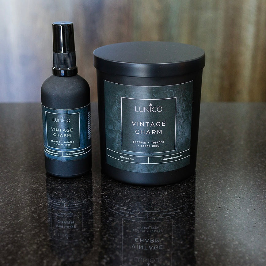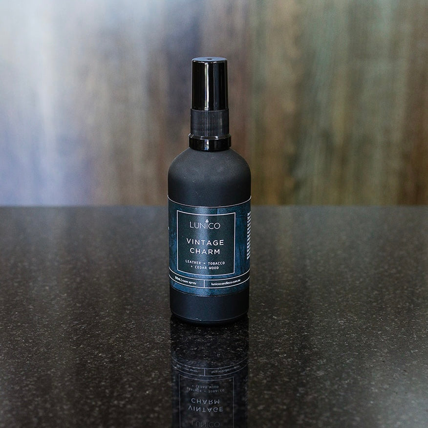 Classy and ageless, our Vintage Charm room spray is clean cut, "shaken not stirred" and, of course, charming. It's mature and sophisticated, with top notes of bergamot and cinnamon, a floral heart of rose oil and leather, with base notes of precious wood aromas and musk undertones. Perfect for lovers of floral, smokey and earthy notes.