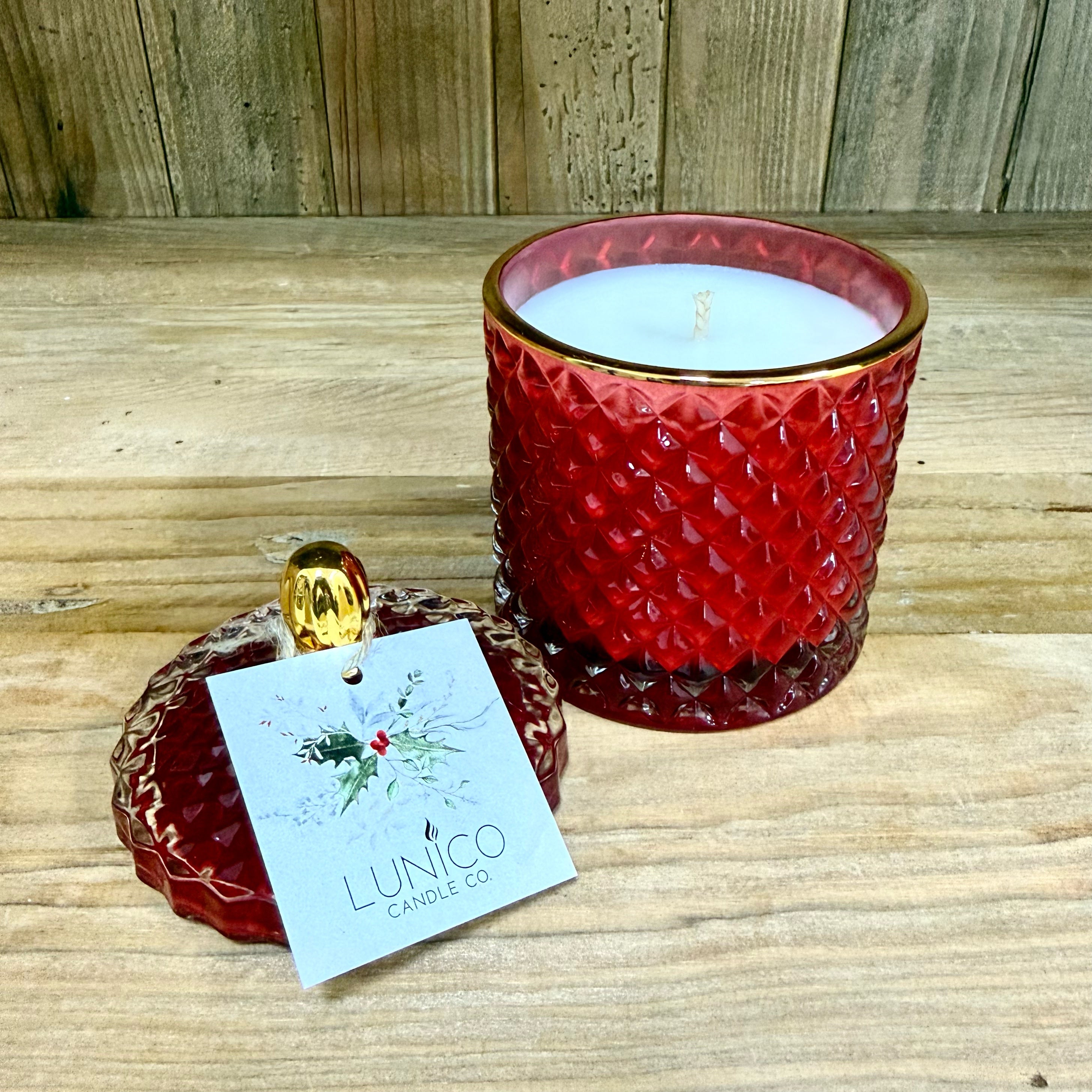 Soy wax candle in a red jar with gold trim and matching lid.