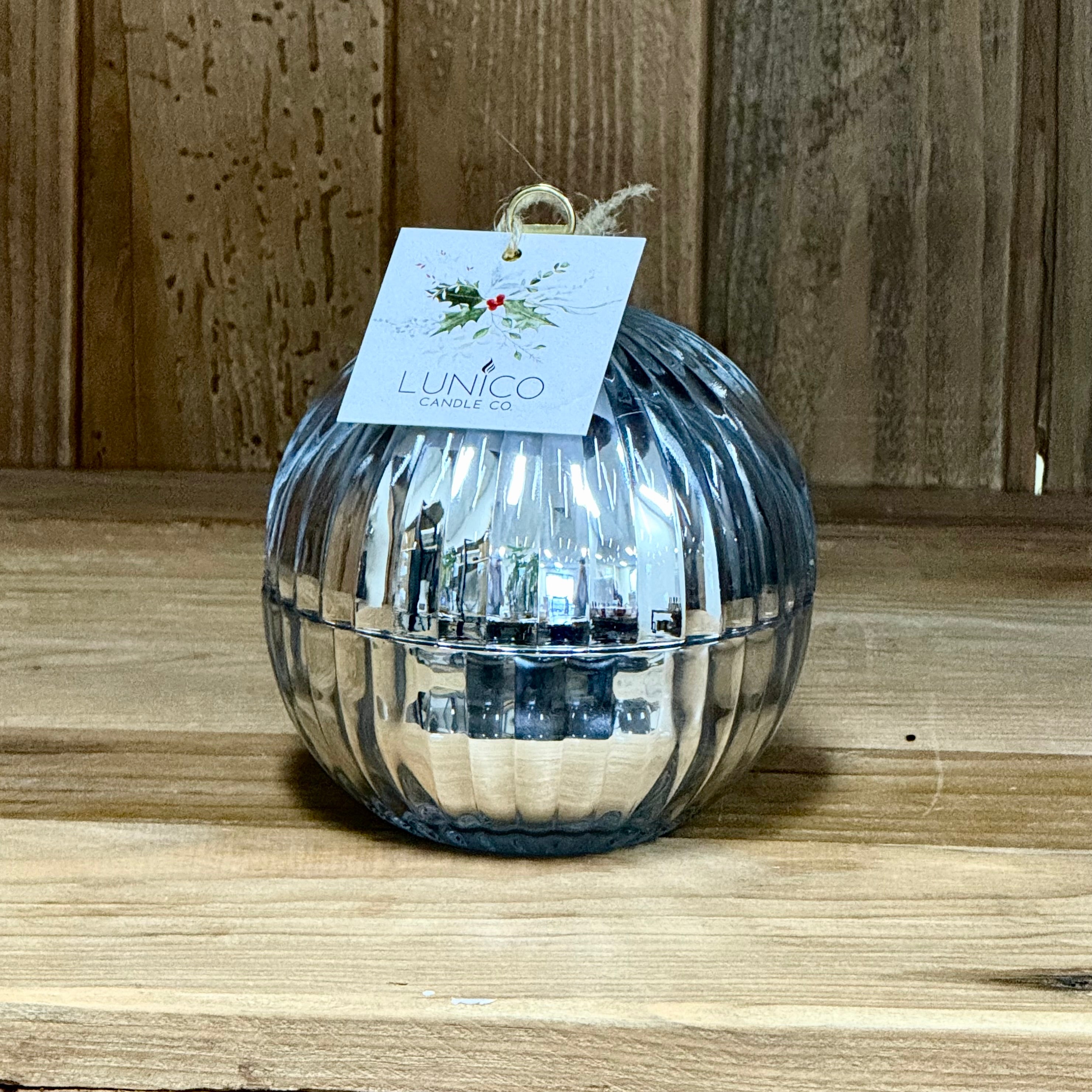 Soy wax candle in a silver Christmas bauble container.